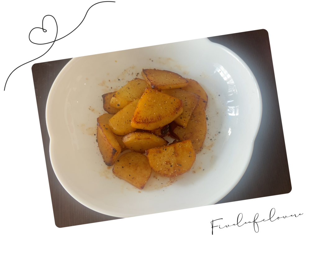 皮を少し厚めにむいて、薄切りにしてバターで炒め、最後に醤油とブラックペッパーを少々。